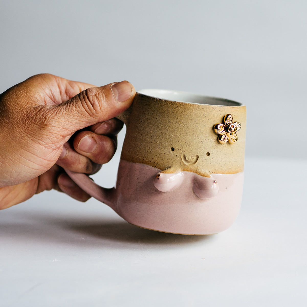 Live free! This cute Free the nipples cup is wheel thrown then mid fired with glossy glaze then finished with gold lustre.