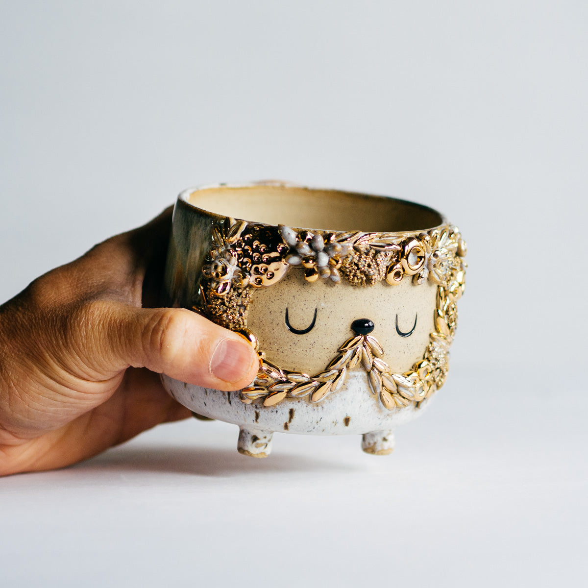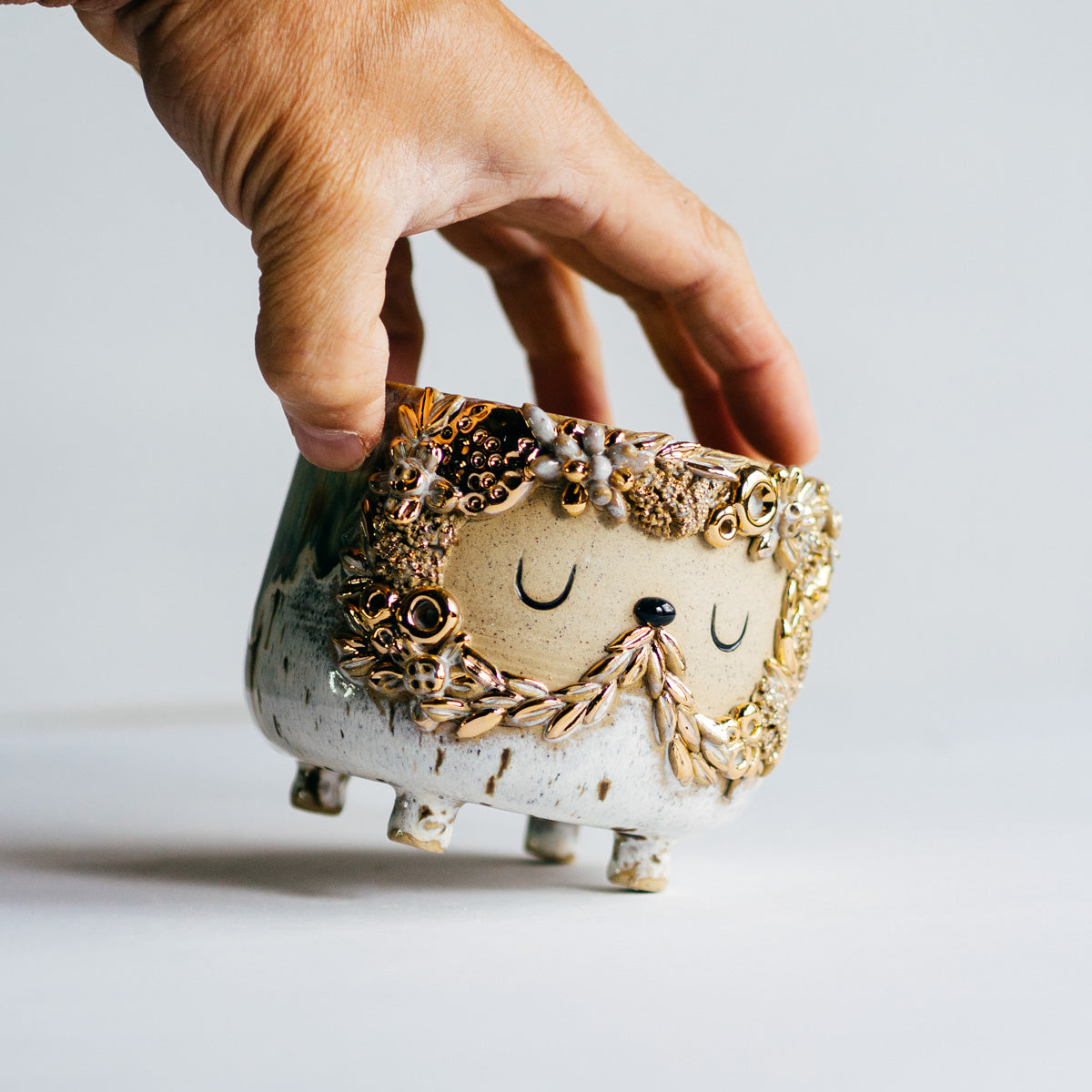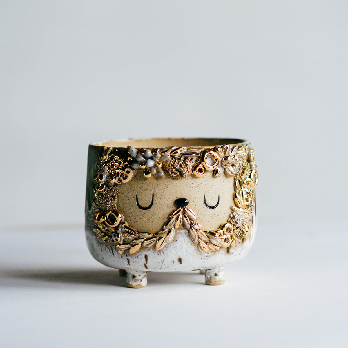 This beautiful Dreamtime planter is wheel thrown then meticulously decorated with fine details. It is mid fired with glossy glaze then finishing touch of real gold lustre. There is a drainage hole at the bottom.