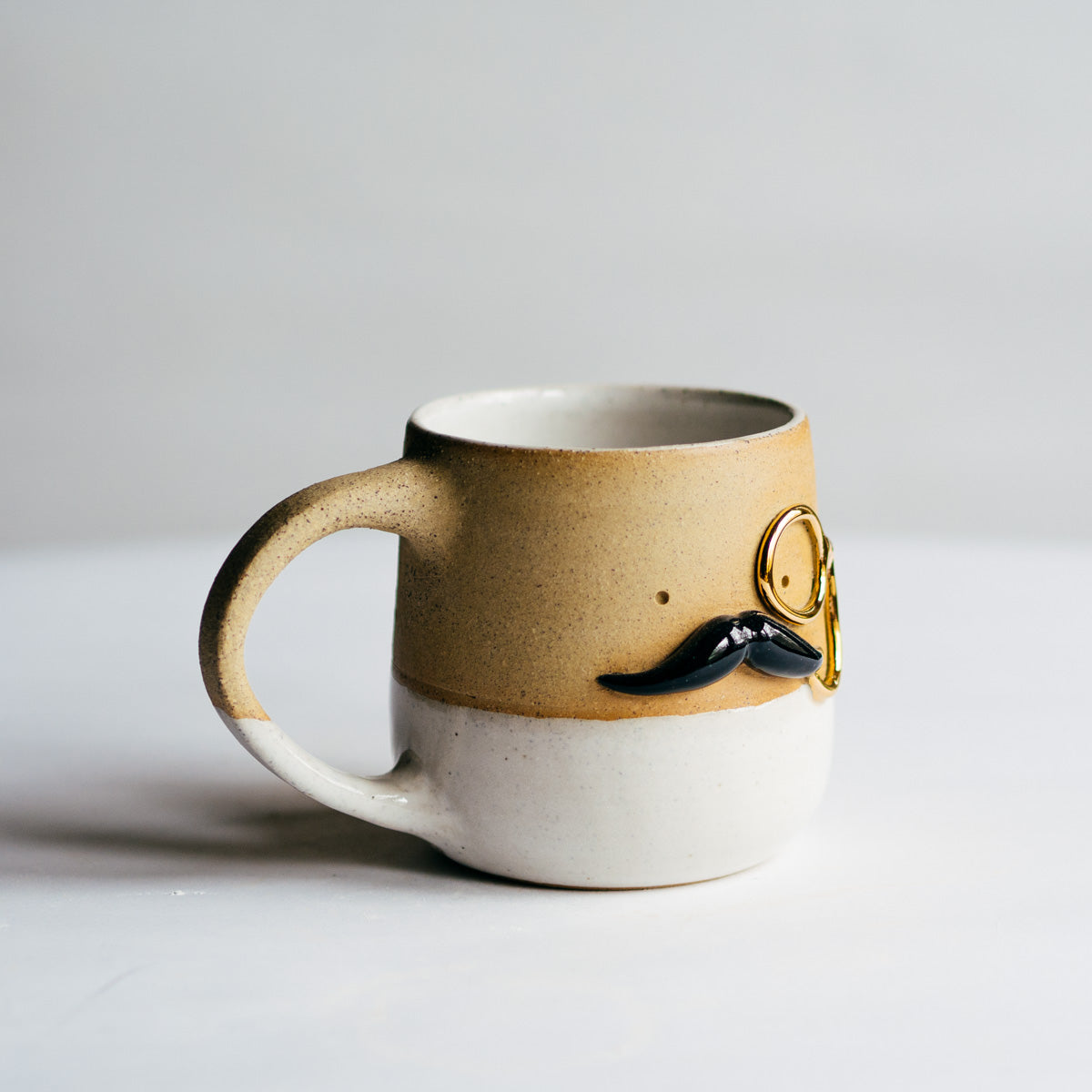 The Mr Mo-nocle cup is back! This cute Mr Mo-nocle cup is wheel thrown then mid fired with glossy glaze then finished off with gold lustre monocle rim.